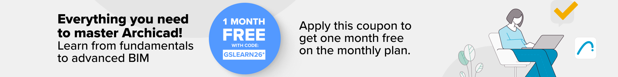 ▶︎ Self-paced Online Program ▶︎ Foundation to advanced level ▶︎ 72 hours (30 courses) ▶︎ Metric unit system ▶︎ €79/Month Master Archicad with the Learn Archicad! Program! Learn to model, document, and visualize designs in Archicad, and become a Graphisoft Certified BIM Author with this comprehensive bundle. Use the COLLABORATE coupon code for 50% discount on all billing periods if you are an Archicad Collaborate Subscriber!